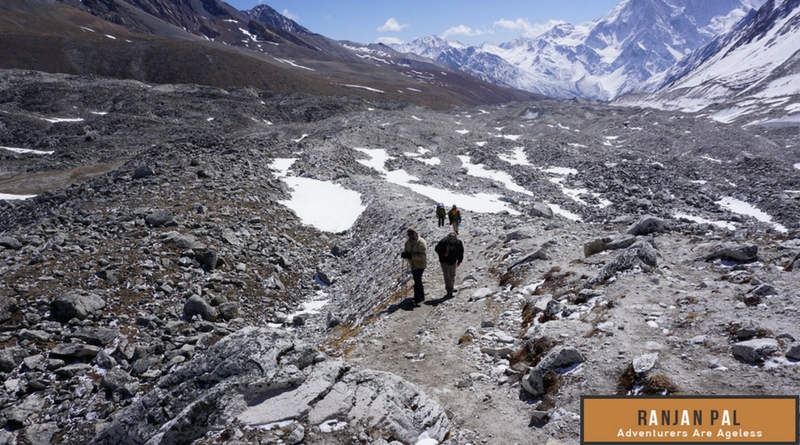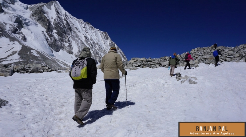 The trail wasn’t particularly difficult but it was long and arduous and wound ever upwards through the moraine following a line of iron staves that acted as beacons showing us pilgrims the way. I straggled along at the back of the pack, plodding upwards, hour after interminable hour. The sun came up and the mountains shone with a blinding brightness that engulfed us all. I began to sweat profusely under my down jacket and fatigue crept its way through every limb. For the first time I began to wonder if I could make it over the top.A sprightly older German couple that we had seen many times on the trail now passed me going strong for the top. Just in front was Divya, the last remaining holdout from Chennai, who had done commendably well for her virgin effort. They smiled and said something about the father-daughter bond becoming stronger in the outdoors. Both Divya and I had to stop to laugh. A moment of much-needed levity that warmed our hearts – who should feel more pleased by this unintentional compliment?