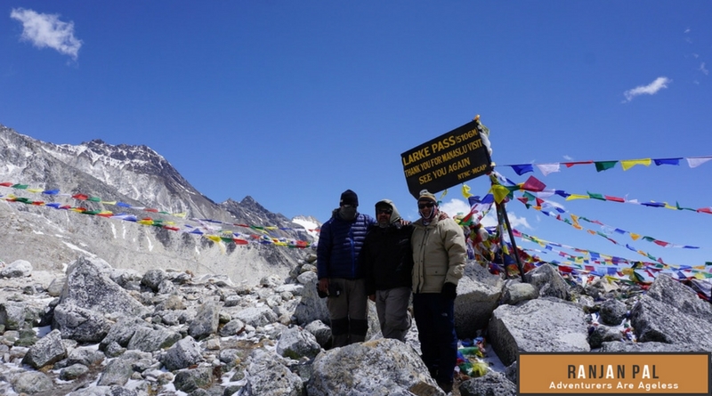 I had to finish but my flesh was weaker than ever before though the spirit remained strong. The guys had been urging me to hand over my daypack to Shyam. But I had resisted this like holding onto some badge of honour, the true trekker carries his own pack at all times is the unwritten code of conduct As I sat slumped over in the snow, Shyam came and lifted it away from my side. The decision had been taken away from me and I felt relieved. I struggled to my feet and stared at the spectacular mountain panorama above as the ridges on either side seemed to be converging. Straining my eyes, I could now see a line of prayer flags just above the blue horizon, tiny bright patches of colour in the unrelenting landscape. It was the pass!!Struggling upwards with renewed enthusiasm, I crossed the remaining snow slopes, not daring to look up and counting my steps all the way. The ground flattened out under me after a last agonising rise and there were my buddies Ashwin and Praveen waiting to welcome me. Six hours after leaving Dharamsala, I had made it to the top of the Larkya La Pass. I had reached the limits of my physical endurance but yet somehow had summoned up the reserves to complete the journey. Maybe I would never do another trek as hard as this one but for now my heart was full of gratitude and my soul was full of relief.